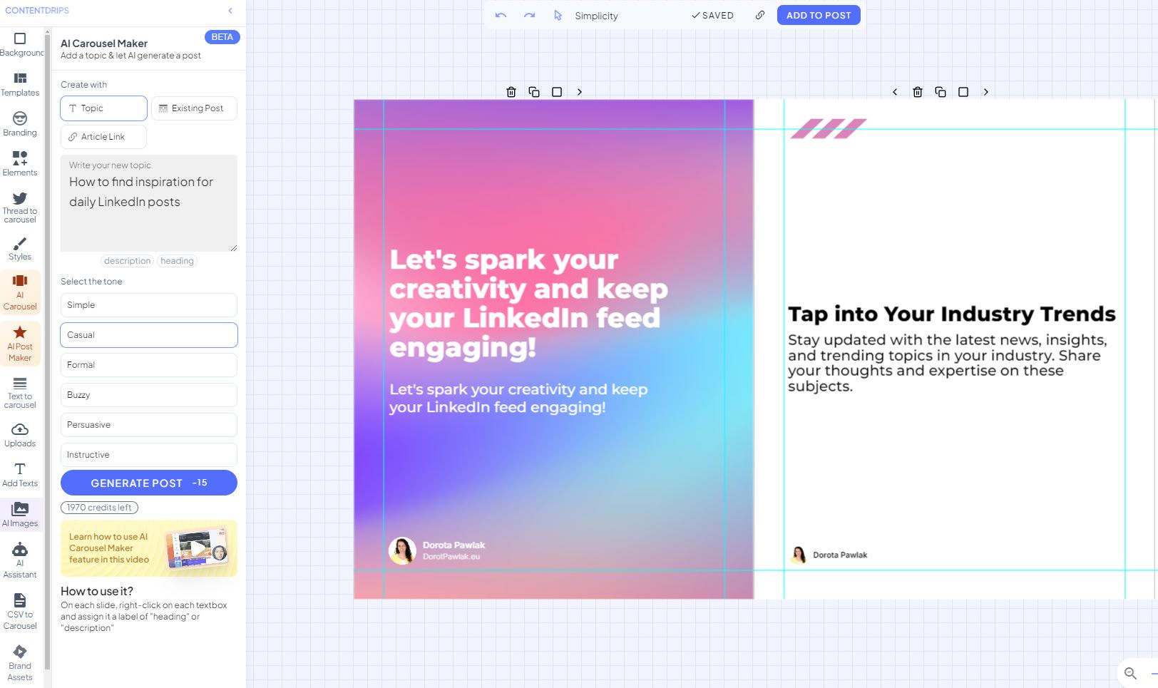 Many useful tools will help you create decent carousels. I’ve tested a few and the winner can only be one: Contentdrips. It’s my go-to tool for all things carousels. It features templates for Instagram, LinkedIn, Infographics, memes, tweets, and quotes. Plus, all these posts can be enhanced with a reasonable dose of AI.